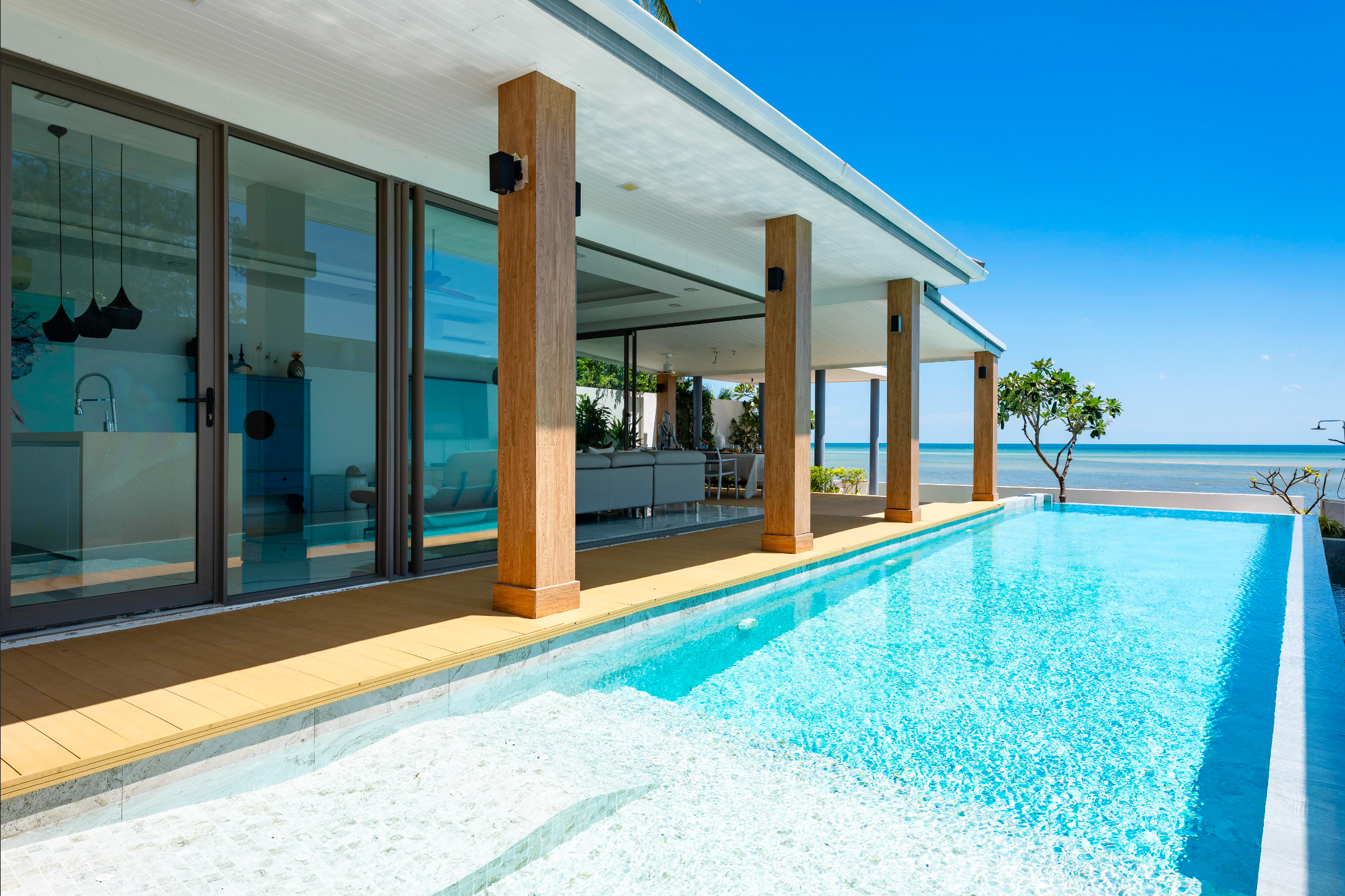 Step outside to your private beachfront sanctuary. The infinity-edge swimming pool overlooks the turquoise waters of Bang Kao Bay, while the expansive terrace is framed by lush tropical greenery. Sun loungers invite you to relax under the island sun, and a shaded outdoor dining area offers the perfect spot for alfresco meals or evening cocktails. Whether swimming, entertaining friends, or simply soaking in the sea breeze, the outdoor space provides a serene backdrop with a touch of luxury.