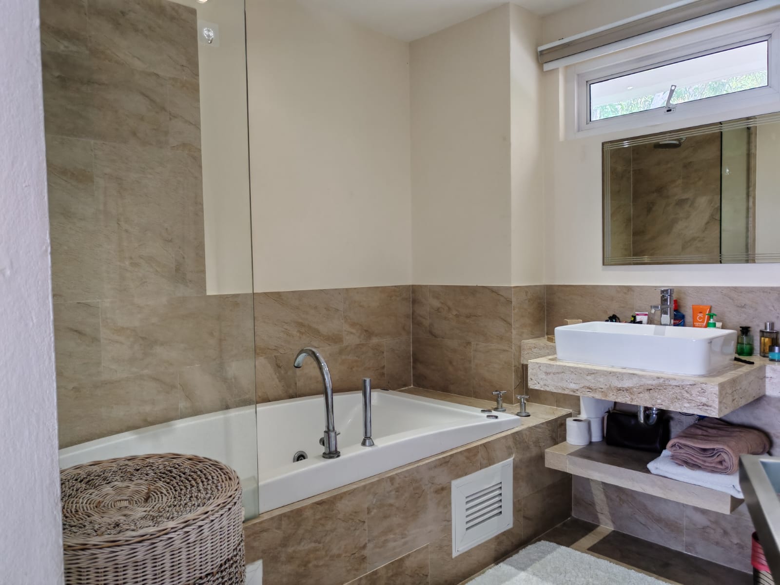 The fully fitted kitchen comes complete with quality appliances, sleek cabinetry, and ample worktop space. Adjacent to the kitchen, the dining area provides a comfortable setting to enjoy meals while overlooking the shared swimming pool and tropical surroundings.