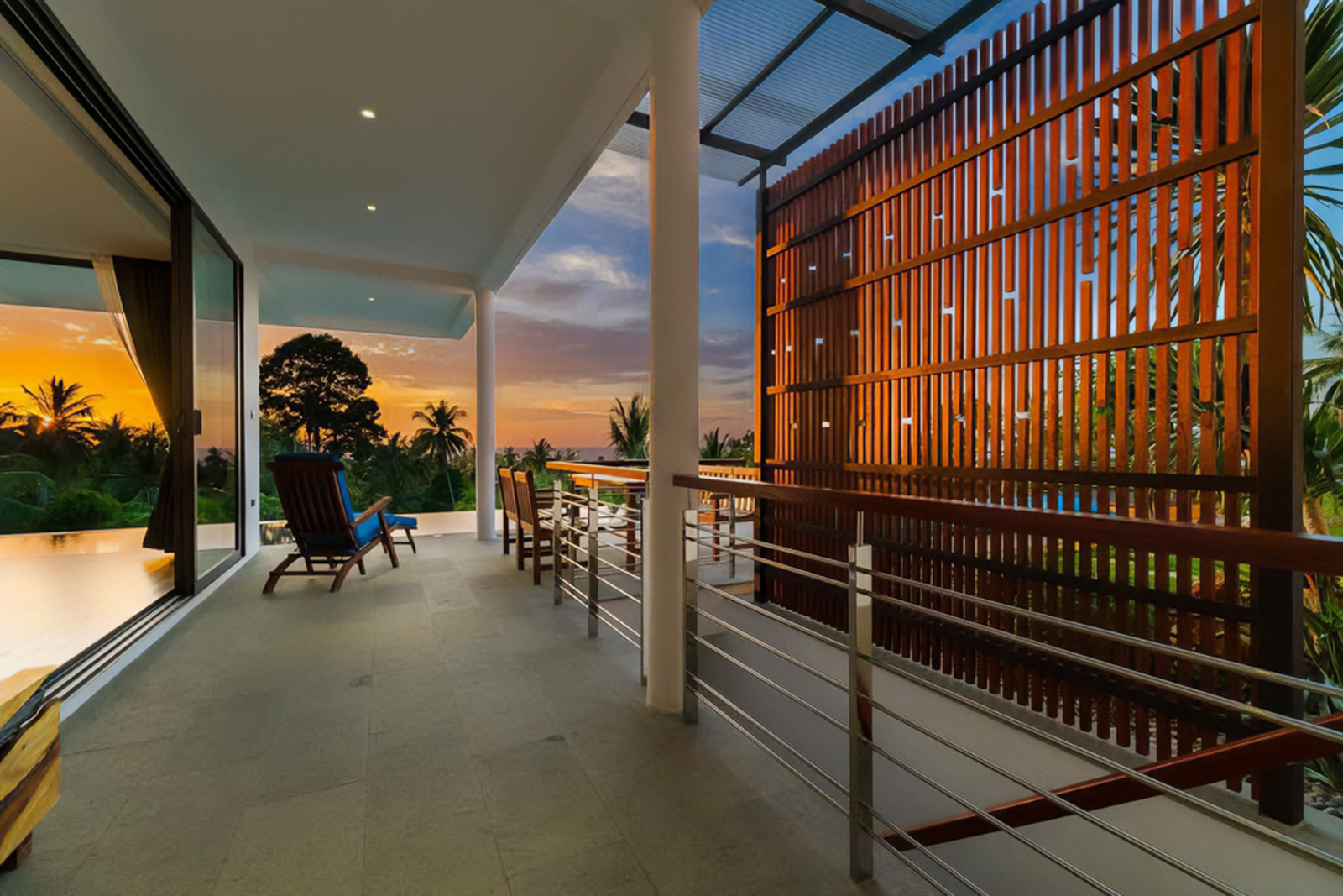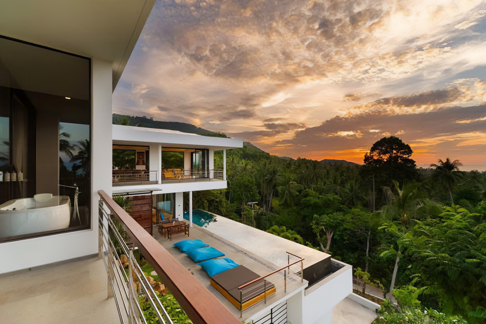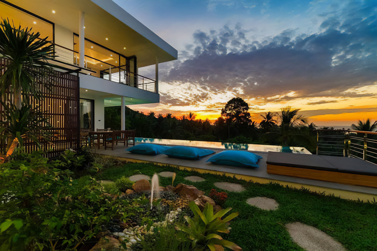 Step outside to your private sanctuary — an infinity-edge swimming pool overlooking the Gulf of Thailand, surrounded by tropical greenery and an expansive terrace. Sun loungers invite you to bask under the Koh Samui sun, while the shaded outdoor dining area is perfect for alfresco meals or evening cocktails. Whether enjoying a refreshing swim, hosting friends, or simply soaking in the sea breeze, the outdoor space provides a serene backdrop with a touch of island charm.