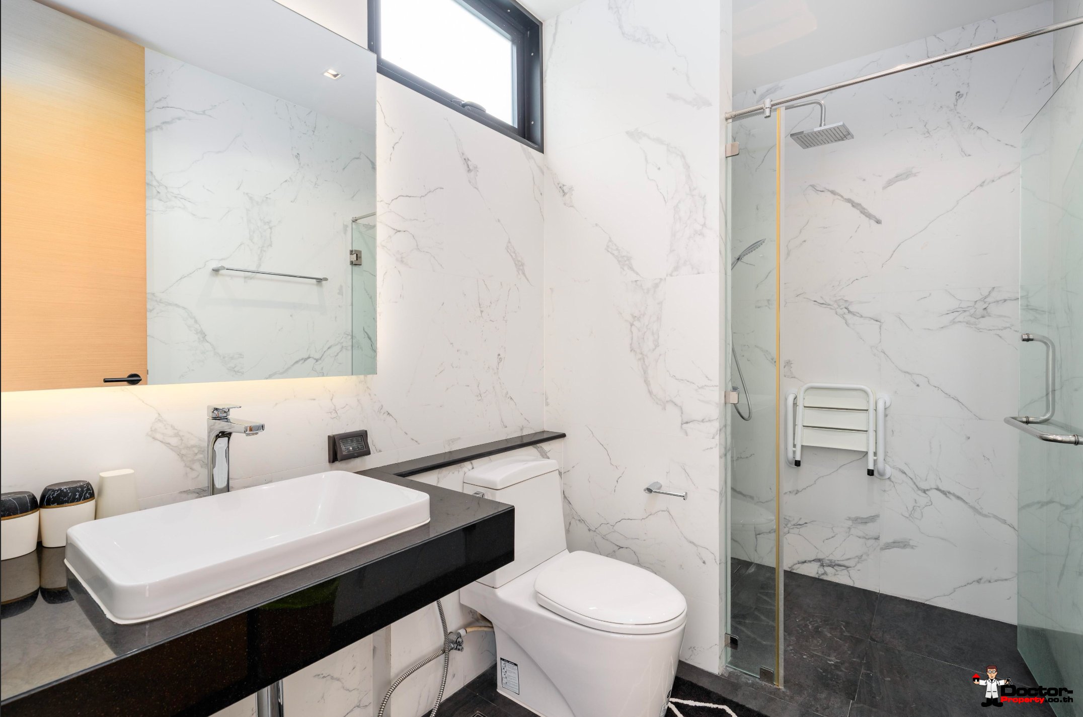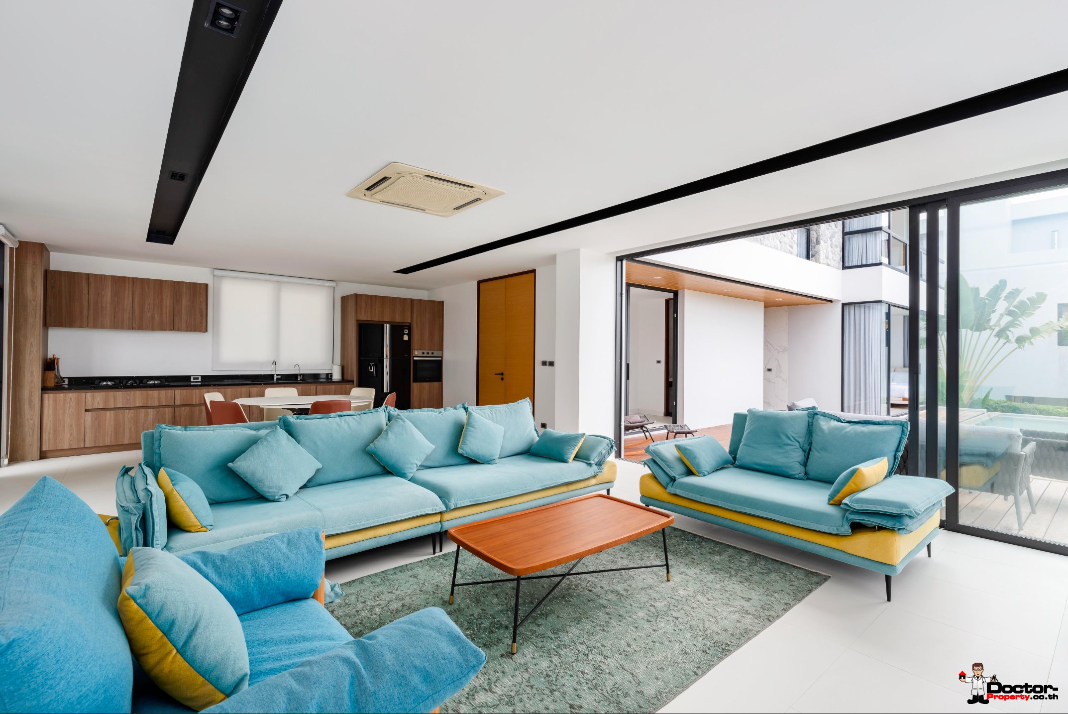 This modern three-storey villa offers a perfect blend of contemporary design and tropical elegance. The open-plan living area is bright and airy, with floor-to-ceiling glass doors that seamlessly connect the interiors to the outdoor terrace. The lounge is tastefully furnished with stylish décor and comfortable seating, creating a welcoming space for both relaxation and entertaining.