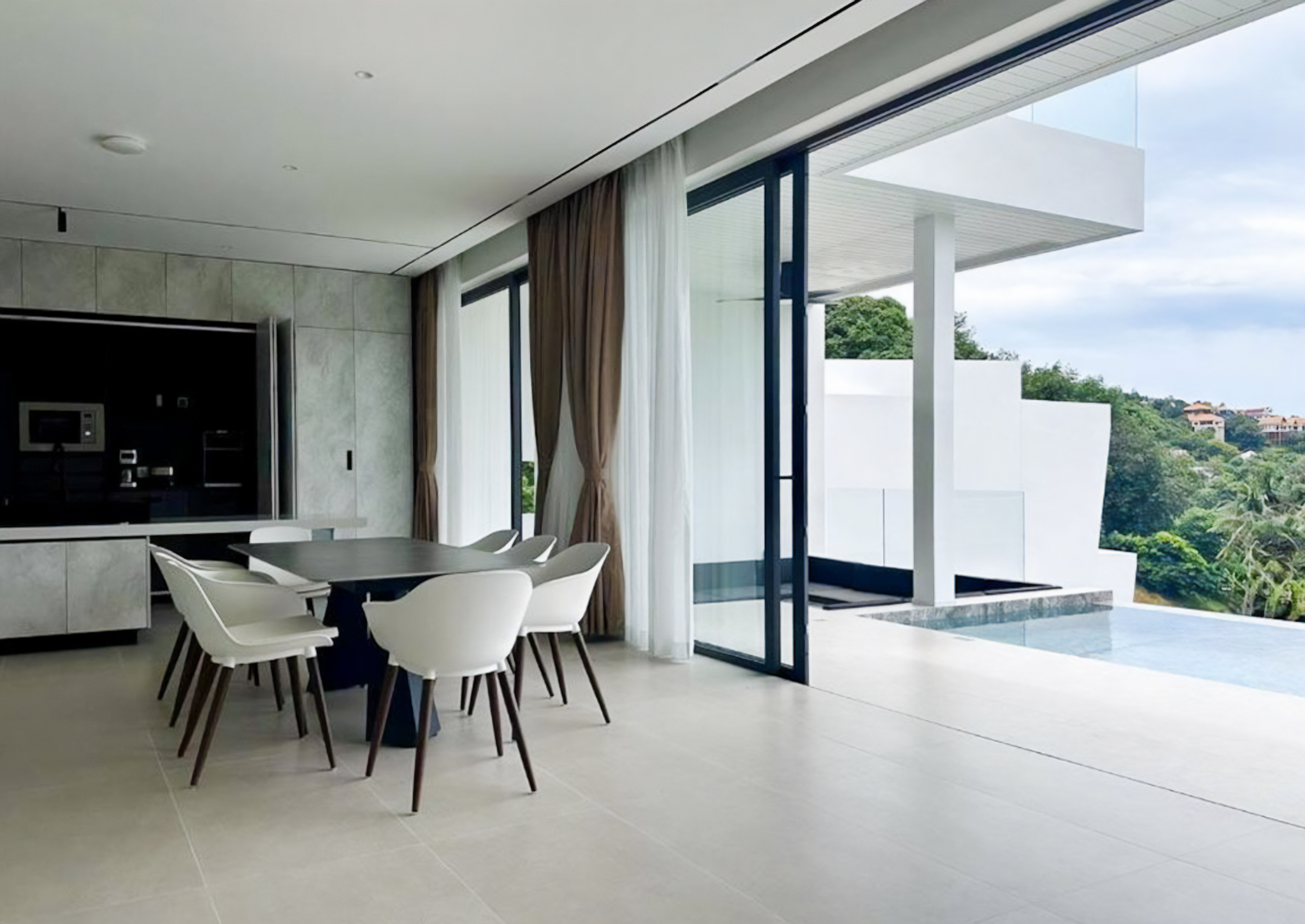 Step outside to your private sanctuary — an infinity-edge swimming pool overlooking the Gulf of Thailand, surrounded by tropical greenery and an expansive terrace. Sun loungers invite you to bask under the Koh Samui sun, while the shaded outdoor dining area is perfect for alfresco meals or evening cocktails. Whether enjoying a refreshing swim, hosting friends, or simply soaking in the sea breeze, the outdoor space provides a serene backdrop with a touch of island charm.