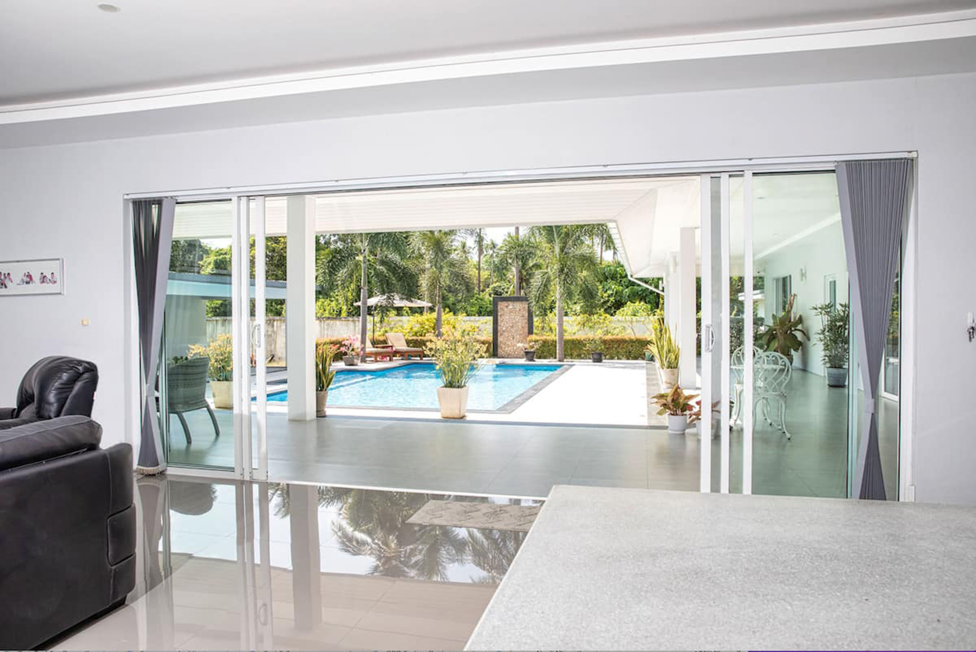 This elegant villa in Na Mueang combines modern design with tropical charm, offering an open-plan layout that seamlessly connects indoor and outdoor living. Expansive sliding glass doors flood the lounge with natural light and open directly onto the terrace, where lush greenery and serene sea views create a tranquil atmosphere. The living area is tastefully furnished with contemporary décor and comfortable seating, perfect for both relaxation and entertaining.